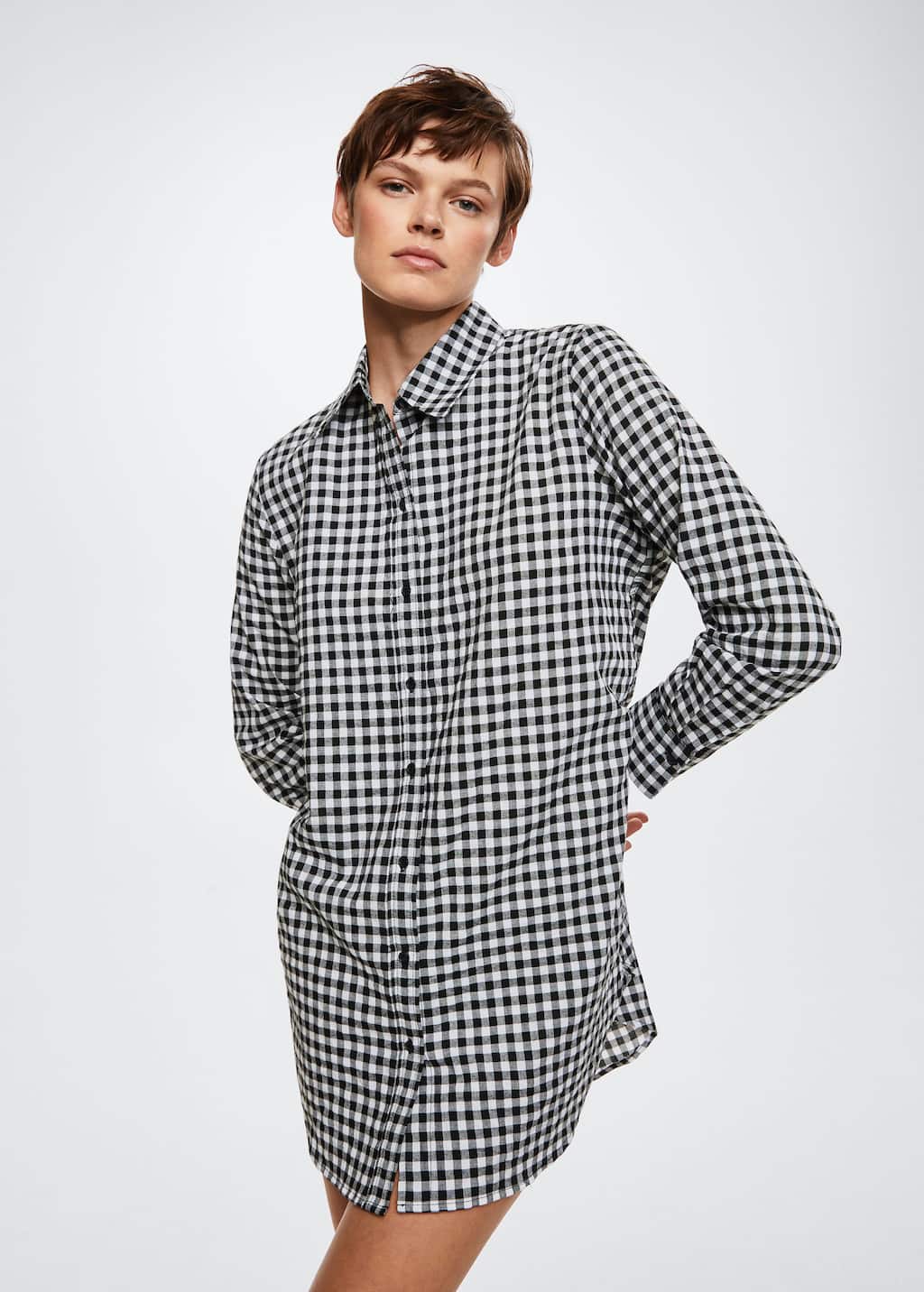 Un camisón confeccionado con mezcla de algodón, con efecto fluido y con un bonito estampado de cuadros vichy. Al más puro estilo clásico, con cuello camisero y cierre con botones en la parte delantera.