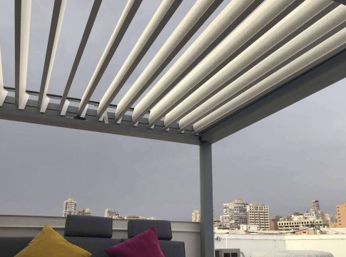 Las pérgolas bioclimáticas cuentan con lamas orientables con una apertura de hasta 135 grados, que impiden el ingreso del agua de lluvia, el cableado y la tornillería se integran totalmente con la estructura, para resultar un trabajo exclusivo, sin filtraciones y elegante.