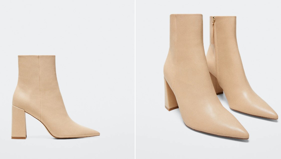 Estas son unos botines efecto piel con terminación en punta y tacón bloque. Viene con cierre lateral de cremallera y el tacón mide 8 cm. Este que te mostramos en la foto es un lindo color beige, pero también puedes elegirlas en negro. Están fabricadas con 100% poliuretano. Las consigues en Mango en las tallas que van desde el 35 al 42 y a un precio de 39,99 euros.