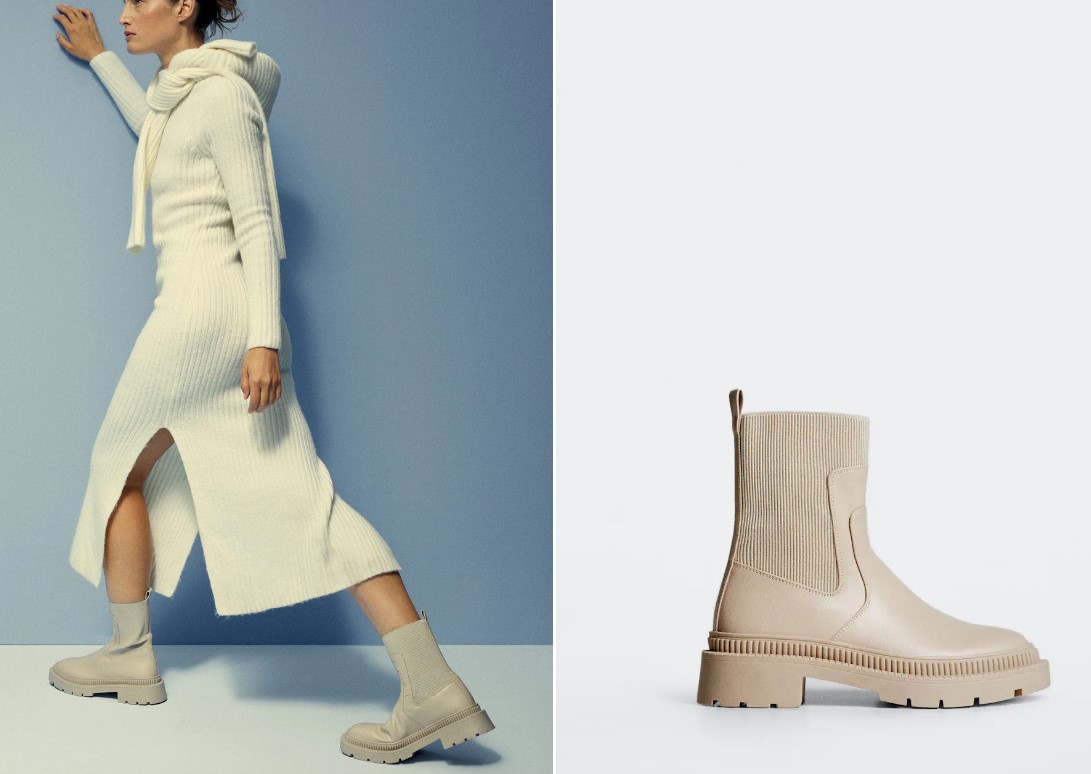 Estos son unos obtienes combinado con suela track y estilo flat. Están confeccionados con efecto piel abatanada y paneles laterales elásticos. Son de caña media y cuenta con una punta redonda. Este que te mostramos en la foto son en un lindo color beige, pero también puedes elegirlas en negro. Están fabricadas con 70% poliuretano y 30% goma (elástica). Las consigues en Mango en las tallas que van desde el 35 al 42 y a un precio de 49,99 euros.