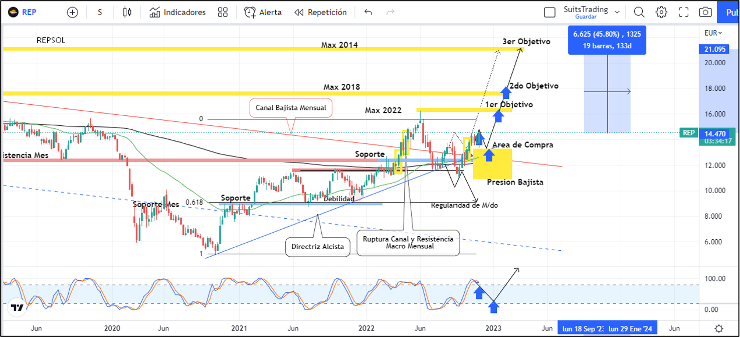 La ruptura sólida de la directriz bajista macro manteniéndose sobre la directriz interna alcista que se ha venido creando desde octubre de 2020, refleja en el precio de Repsol un potencial movimiento, especialmente sobre los 13,5 euros que comentábamos como área de compra, los cuales visitó dando la gran oportunidad al punto exacto y desde donde se ha revalorizado más de un 8%.