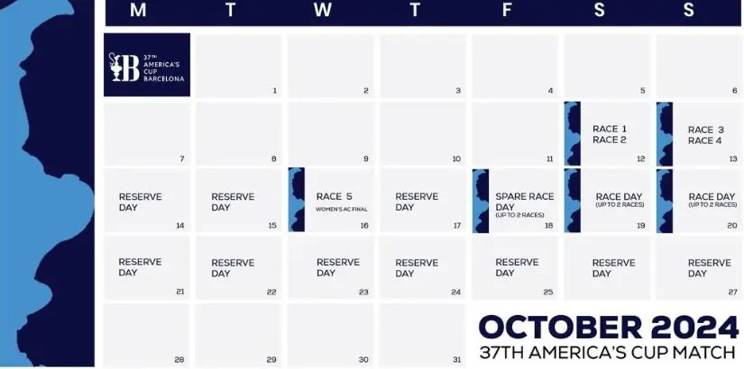 El jueves 17 de octubre no está oficialmente programado para regatas pero, de nuevo, sujeto a la discreción del director de la regata y al acuerdo con los competidores, podría asignarse para dos regatas más dependiendo de las condiciones, mientras que el viernes 18 está oficialmente marcado como ‘día de reserva’ para hasta dos regatas más. El sábado 19 y el domingo 20 de octubre de 2024 serán también ‘días de reserva’ para disputar dos pruebas cada uno, si fuese necesario.