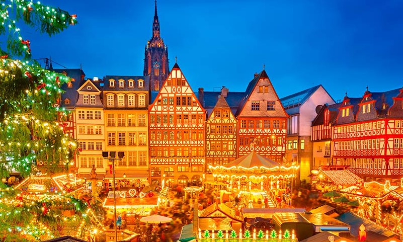 Alemania se ilumina cuando se acerca la navidad y podrás descubrir el encanto y la magia de sus mercadillos. El mercado de Frankfurt es increíble. Con su parte vieja encantadora durante todo el año, pero decorada especialmente bonita para estas fechas y los altos edificios del distrito financiero con su apariencia futurista, hacen de este lugar un rincón idílico donde respirar la magia de la Navidad.