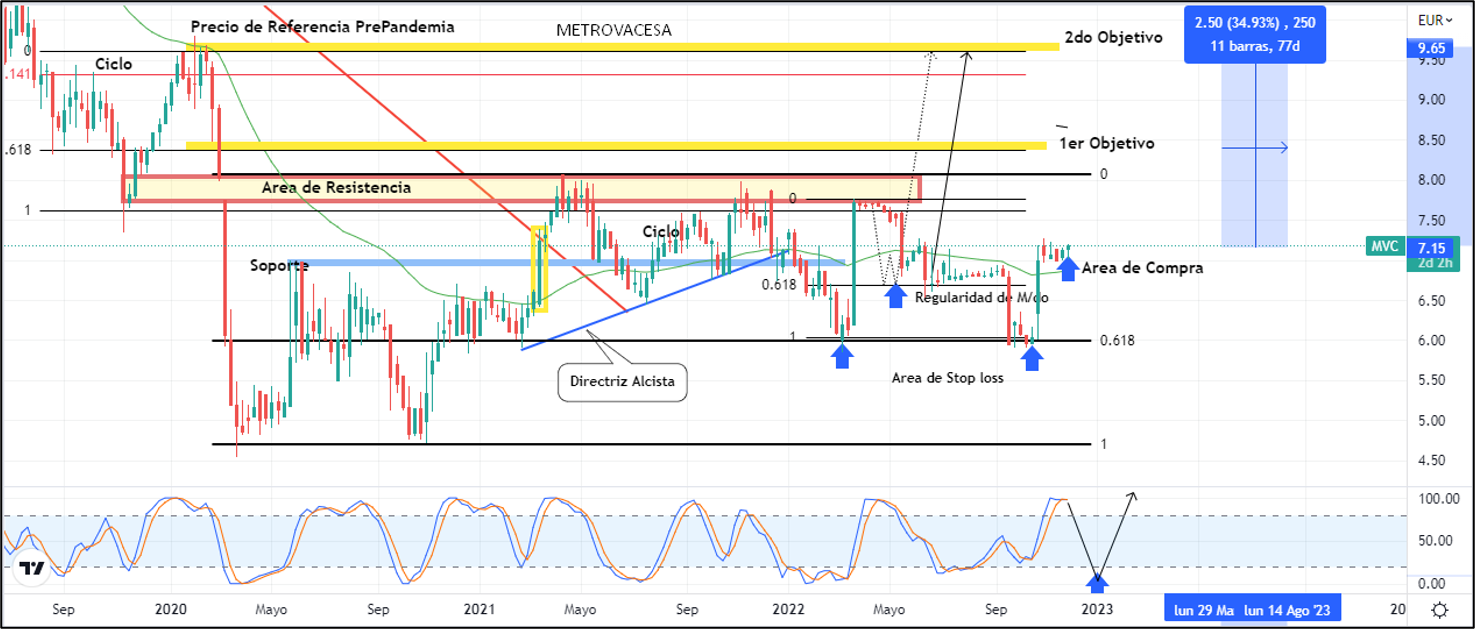 Las acciones de Metrovacesa activaron nuevamente nuestra alerta de compra la cual venimos realizando desde marzo de este año cuando alcanzó niveles promedio de 5,9 euros por acción, visitando y respetando el área de regularidad del mercado en el 61,8 de retroceso de Fibonacci que tanto repetimos en nuestros artículos. La acción de Metrovacesa desde marzo se mantuvo en una tendencia lateral bajista resquebrajando el precio un 23,5% desde los máximos alcanzados con el anuncio de la OPA oferta por Carlos Slim, la cual no se saldó de acuerdo con las pretensiones iniciales.