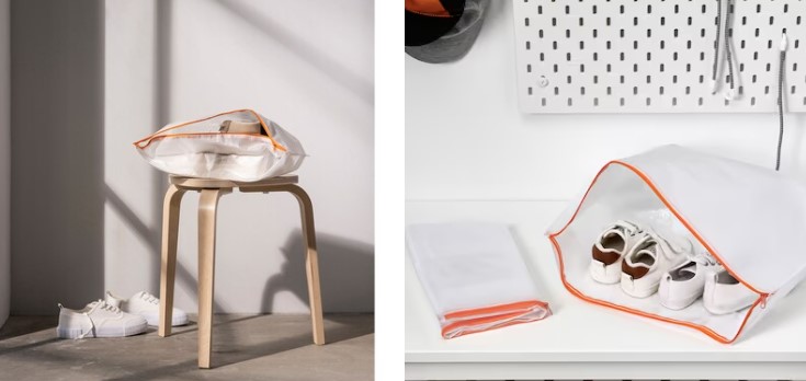 Esta es una bolsa para zapatos de Ikea. Podrás guardarlos y quitártelos de en medio o llevártelos a cualquier viaje. En la bolsa cabe un par de zapatos grandes o dos pares de zapatos pequeños. Ideal para llevar de viaje y proteger el resto de las cosas del calzado sucio. Cuando esta bolsa para zapatos está vacía, apenas ocupa espacio, puesto que se pliega hasta quedar completamente plana. Las medidas que tiene son 48×22 cm y está realizada con 100% polipropileno, 100% polipropileno (40 % reciclado como mín.). El precio es de tan solo 0,99 euros.