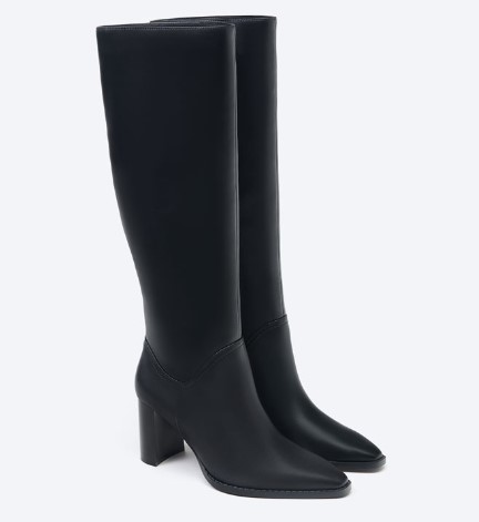 Estos son unos zapatos tipo bota alta de Lefties que consigues únicamente en color negro. El diseño cuenta con detalle de pespunte en corte, acabado en punta y tacón medio ancho de unos 9 cm. La altura de la caña es de 41 cm. Los consigues desde la talla 35 hasta la 41, por un precio de 40 euros.