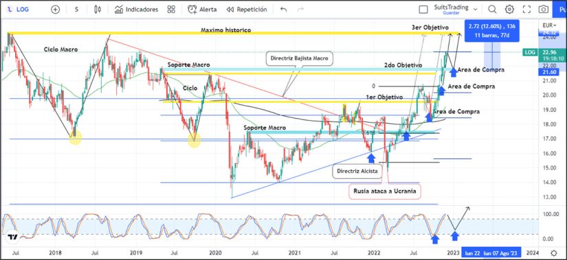 Desde diciembre del año pasado venimos realizando algunas compras las cuales han desarrollado más del 40% de revalorización, cumpliendo con el primer y segundo objetivo, pero manteniendo la fuerza necesaria para buscar el tercer objetivo que ubicamos en sus máximos históricos sobre 24,3 euros.