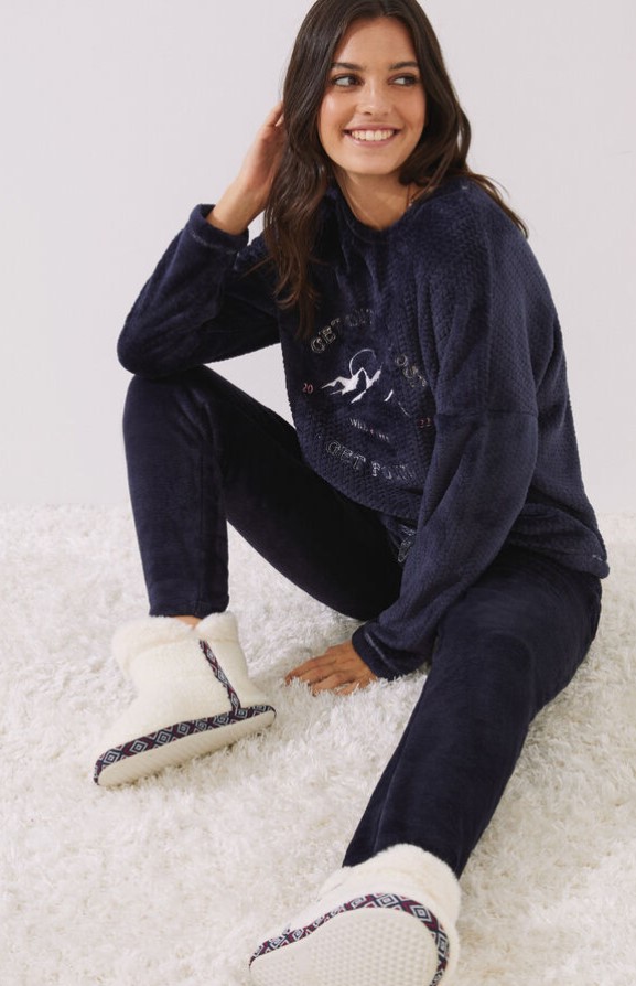 Este es otro pijama de dos piezas de Women’Secret en tejido polar mousse calandrado azul marino. La camiseta de manga larga es con cuello redondo, cinturilla ajustable Loopable y frontal posicionado. El pantalón largo es con elástico en el bajo y en la cintura para que estés siempre cómoda. Perfecto para las noches frescas de un auténtico aventurero. Puede ser tuyo por solo 27,99 euros, ya que cuenta con una rebaja del 30%.