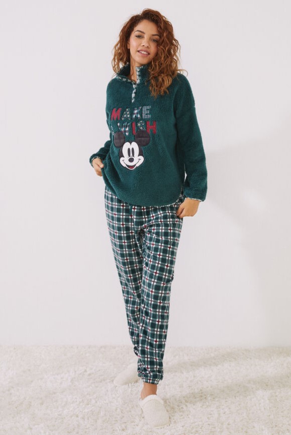 Este es otro pijama de dos piezas de Women’Secret confeccionado en tejidos de lana y polar, color verde botella con estampado de cuadrados y estampado de Mickey Mouse. La camiseta es tipo sudadera con cuello alto y botones automáticos. El pantalón es estampado con puños y cintura elástica para un mejor ajuste. Perfecta para cuando llega el frío y súper original. Cuenta con un descuento del 40% por lo que puede ser tuyo por 23,99 euros.