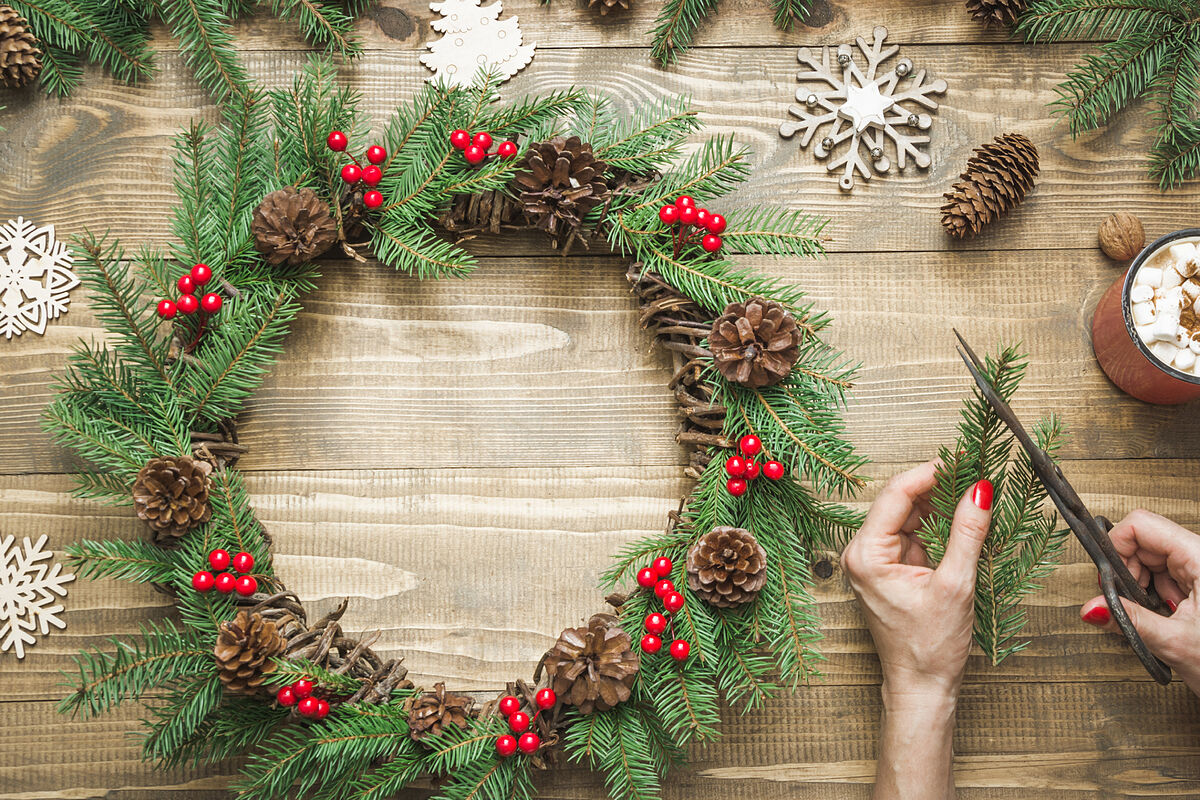 Para hacer una corona o centro de mesa, lo primero será elegir la base más adecuada: una base de esponja (la encontrarás en floristerías), ya que es lo mejor para que puedas regar tus flores y se mantengan frescas. Pero si no tienes, te podrá servir una bandeja, una cesta, un plato grande o una caja de cartón o madera, en la que tendrás que incorporar una esponja para que absorba el agua. Para componer los centros de mesa navideños más bonitos solo tienes que elegir tus flores y plantas favoritas para que sean las absolutas protagonistas. En Navidad quedan genial las ramas de pino, muérdago o acebo y también las piñas.