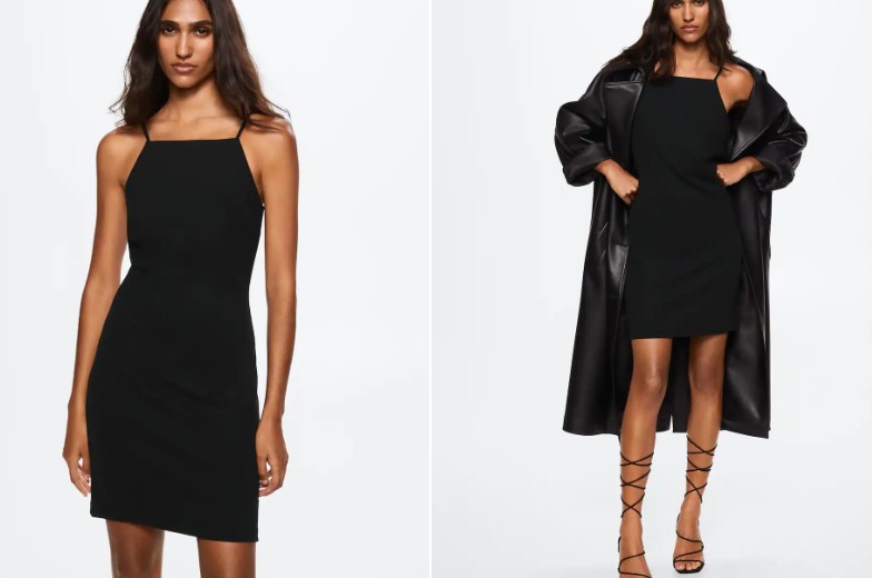 El primer vestido de Mango que te vamos a mostrar, es un diseño entallado, corto, con cuello halter y sin mangas. Tiene tirantes finos y el tejido es mezcla de poliéster reciclado, tipo canalé elástico. Pertenece a la Colección fiesta y ceremonia y es una prenda etiquetada como Committed. Son productos que han sido confeccionadas con fibras y/o procesos de producción sostenible, reduciendo así su impacto ambiental. Lo consigues en dos colores: negro o verde. Los talles disponibles son del XXS al XXL. Si te gusta, está rebajado, por lo que puede ser tuyo por 12,99 euros.