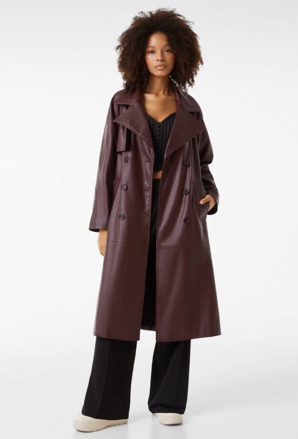 Este es un trench efecto piel de Bershka en color granate que consigue adaptarse a cualquier look y elevarlo, tanto en el día a día como en aquellos eventos en los que queremos destacar. Incluye el característico cinturón de este tipo de prendas y botones para cerrarla. Confeccionada en 100% poliuretano, la consigues en las tallas del XS al L por 59,99 euros.