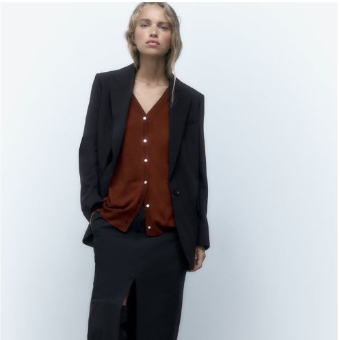 Y hablando de fiesta, aunque igual te vale para llevar al trabajo o el día a día, esta chaqueta de punto con botones encaja como ves en la foto con un look festivo sobrio y moderno, alejado de los vestidos anteriores. También tiene un 42% de descuento y el precio se queda en 15,99 euros. Es una chaqueta larga de punto con escote pico y manga larga, con acabados en rib y cierre frontal con botones combinados a tono.