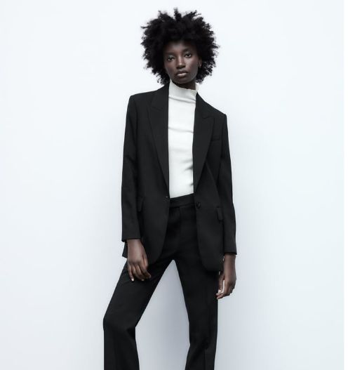 Luego veremos otro, pero comenzamos con este blazer oversize, también ideal para las celebraciones venideras. Está confeccionada con tejido en mezcla de viscosa, cuello solapa y manga larga, bolsillos con solapa en delantero y de vivo en pecho, forro interior combinado a tono y cierre frontal con botón. Ahora está rebajada un 33% y el precio se queda en 39,99 euros. Pura elegancia sobria y por tanto ideal para una cena de empresa o de fin de año.