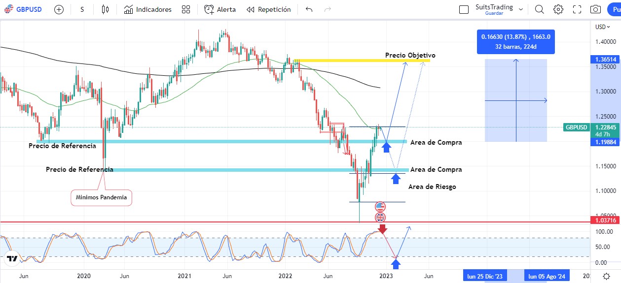 Este movimiento puede visitar los mínimos registrados en agosto y septiembre de 2019 en inmediaciones de 1,1975, precio de referencia que sirve como soporte de nuevos movimientos alcistas, a su vez indica que, si el precio desarrolla una ruptura de dicho nivel, debería buscar entonces la regularidad del último movimiento alcista hasta inmediaciones de 1,1350 que a su vez representa soporte y precio de referencia registrado como mínimos alcanzados por la llegada de la pandemia en marzo de 2020.