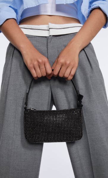 Este es otro minibolso negro de malla de aluminio con strass plateados de Stradivarius. Viene con un asa de hombro y una cadena larga, por lo que podrás llevarlo cruzado, lo que te resultará muy cómodo si vas a estar bailando o moviéndote de un lado a otro. Cuenta con unas medidas de 19 cm x 11 cm x 4 cm. Está confeccionada con 85% poliéster y 15% poliuretano. El precio de venta es de 15,99 euros.