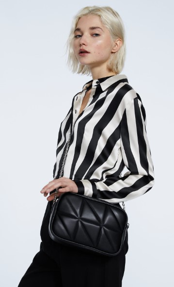 Este es otro bolso de Stradivarius, estilo bandolera acolchada en un clásico color negro, pero que también está disponible en varios colores. El asa es una cadena larga para que puedas llevarlo cruzado o al hombro. Cuenta con unas medidas de 22 cm x 14 cm x 6 cm. Está confeccionada con 95% poliuretano y 5% hierro. El precio de venta es de 15,99 euros.