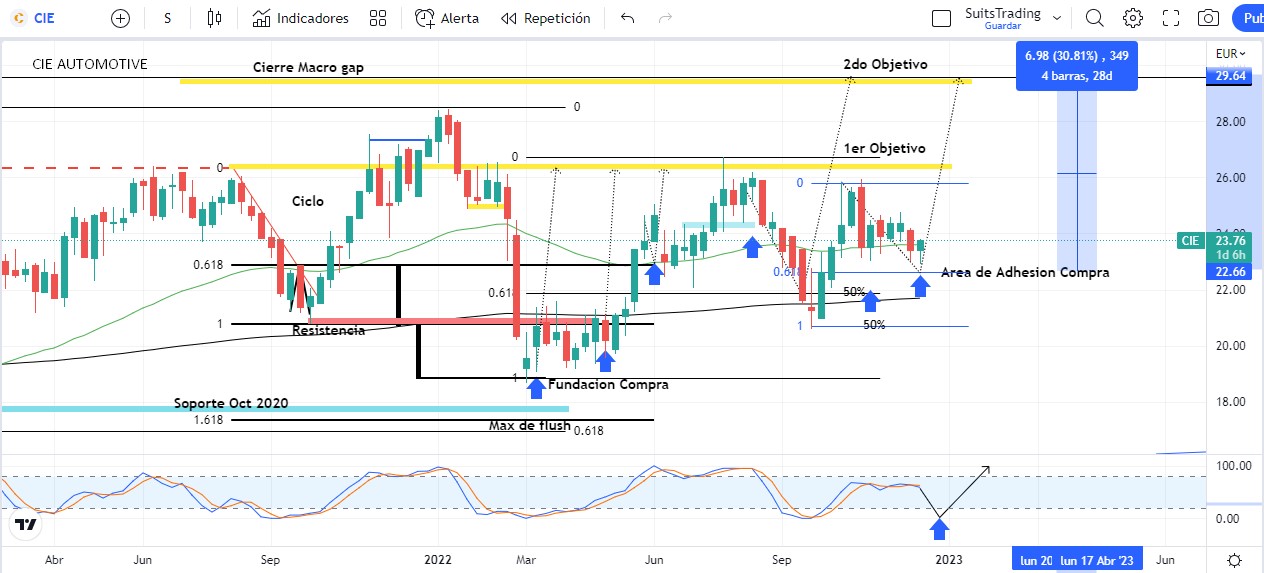 Estimamos un segundo objetivo en inmediaciones de 29,7 euros que corresponde al cierre del gap macro que se produjo en 2018, cuando CIE Automotive fue incluida en el Ibex 35, de esta forma, si el precio recupera los 30 euros, de seguro visitará la única resistencia macro que tiene establecida en 31,2 euros y probablemente buscará los máximos históricos sobre 36,3 euros, lo que daría más de un 60% de revalorización desde los niveles actuales.
