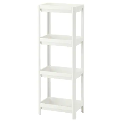 Esta estantería es perfecta para aportar un espacio extra de almacenaje en estancias pequeñas como el cuarto de baño. Es pequeño pero con espacio suficiente para organizar los productos de aseo, cosméticos y otros pequeños objetos. Los bordes de cada balda están un poco elevados para que los objetos no se caigan. Se monta sin herramientas muy fácilmente. Las medidas son 100,6 x 35,7 x 23,3 cm (alto, ancho, fondo), y cada balda permite un peso máximo de 4 kilos. El precio en Ikea es de solo 10 €.