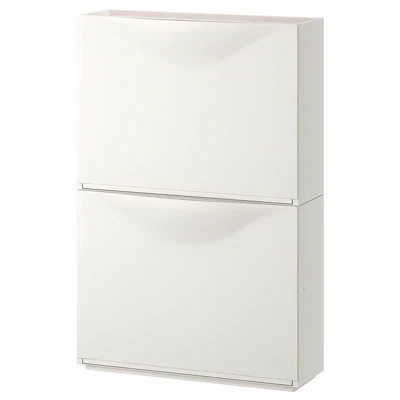 Este zapatero es un 2 en 1 porque sirve para guardar zapatos y servir como repisa para apoyar el móvil, las llaves o el periódico. Es un organizador para calzado ideal para entradas o pasillos estrechos, ya que tiene poco fondo y un práctico sistema de apertura con puerta abatible. También es ideal para guardar complementos como guantes, gorros o bufandas. Se pueden combinar varios armarios a la altura que se desee. La puerta es desmontable para limpiar cómodamente el erario por dentro. Es de color blanco y se venden en sets de 2 unidades por 25 €.