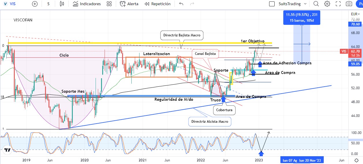 Lo cierto es que en épocas de recesión las acciones del sector de alimentos se convierten en punto de mira por lo cual, las acciones de Viscofan no son la excepción, tanto así, que la acción ha realizado una estructura técnica con la respectiva ruptura solida de la directriz bajista macro que prevé un potencial movimiento al alza en busca de nuevos máximos históricos sobre los 66,2 euros, que corresponden a más de un 6% de revalorización desde el nivel actual.