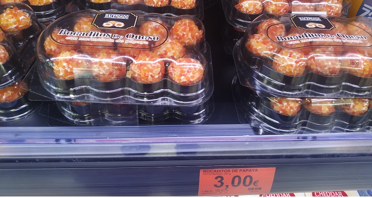 El primer producto son los bocaditos de queso con mermelada de papaya. Por tan sólo 3 euros, podemos conseguir un entremés exquisito para poner en nuestra mesa y que nos comensales vayan picando hasta que lleguen los platos fuertes. Como su nombre indica, es queso recubierto de mermelada de papaya.