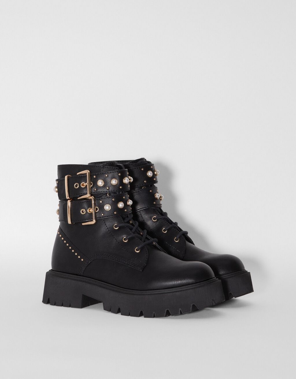 Los botines planos de estilo militar se reinventan esta temporada con hebillas y tachas en tonos dorados y un original diseño de perlas. Sin duda, estamos ante una de las botas más llamativas de Bershka.