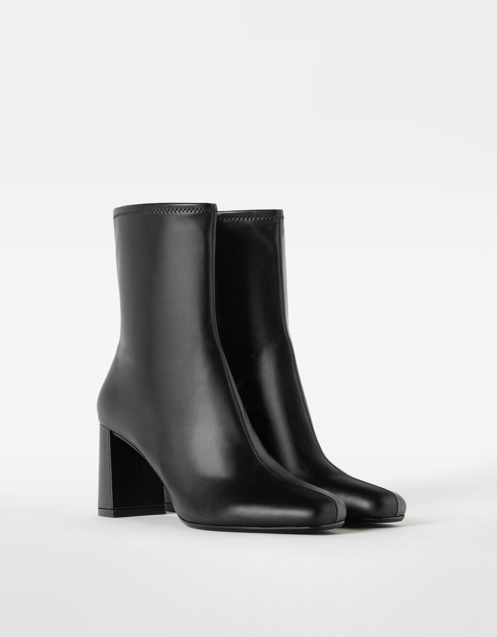 Un buen ejemplo son estos botines de caña ajustada efecto calcetín, siguiendo las últimas tendencias, con punta cuadrada y tacón grueso de 7,5 cm. Equipados también con plantilla técnica flexible de espuma.
