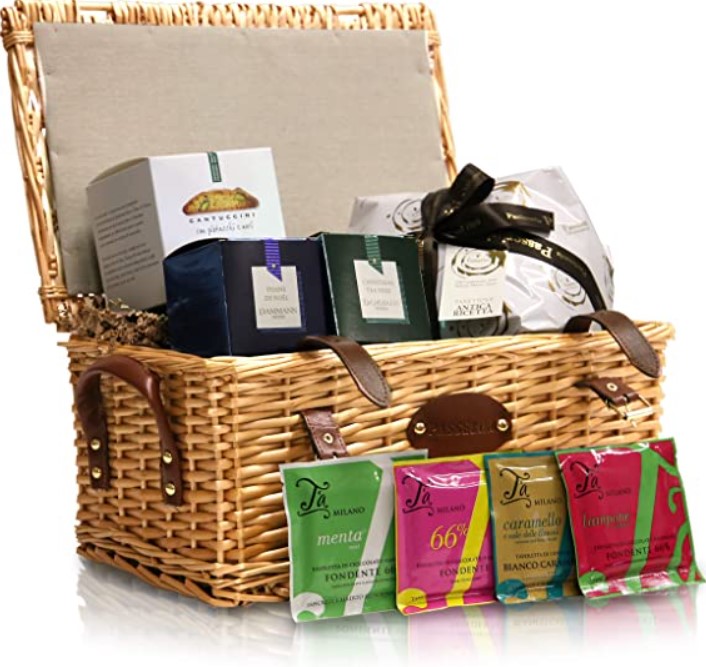 Para los amantes de los dulces, esta cesta de Navidad es ideal. Formada por un surtido de dulces italianos, incluye: 1 Panettone, 4 Tabletas de chocolate, 2 Cajas de Té Dammann Frères y 1 Paquete de Cantuccini. La cesta de mimbre contiene el lote de productos y mide 48x20x31 cm y está incluida en el precio. Podrás utilizarla como baúl para guardar manteles y servilletas e incluso como cesta de pícnic. La consigues en Amazon por 109 euros.