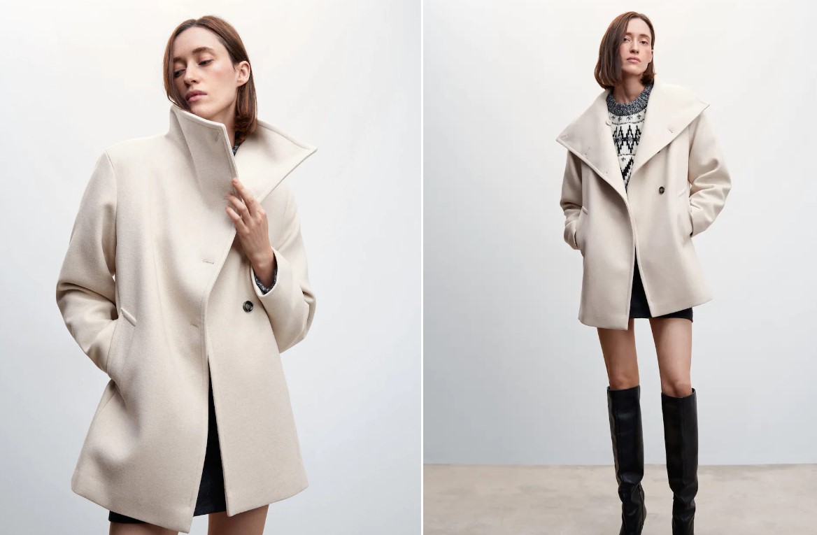 Este es otro abrigo de Mango con tejido mezcla de lana reciclada. Diseño medio y recto con cuello chimenea. Es de manga larga, con cierre de botones en la parte delantera. Dos bolsillos laterales y forro interior. Disponible en color crudo, en las tallas del XXS al XXL. El precio de venta es de 79,99 euros.