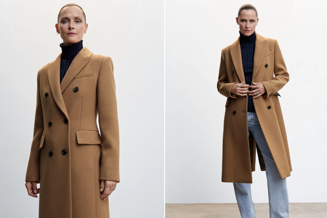 Este es otro abrigo de Mango en tejido mezcla de lana. Diseño doble botonadura, largo y entallado. Con cuello pico con solapa, solapas con muesca y manga larga con puños abotonados. Tiene dos bolsillos de solapa en la parte frontal, abertura posterior en el bajo y forro interior. El cierre es de botones en la parte delantera. Disponible en negro, azul marino oscuro y marrón medio, en las tallas del XXS al 4XL. El precio de venta es de 99,99 euros.