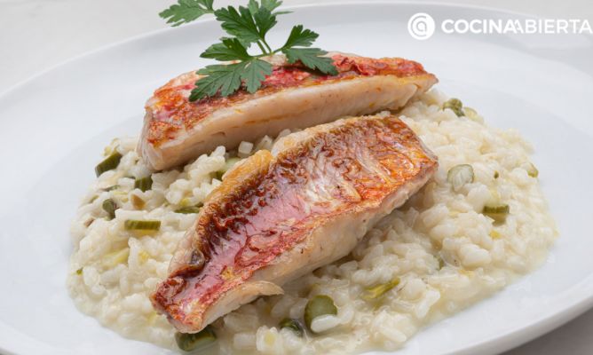 Finalmente, sazona los lomos de salmonete que habías reservado, riégalos con un chorro de aceite y hazlos a la plancha. Finalmente, monta los lomos sobre el arroz para decorar el plato.