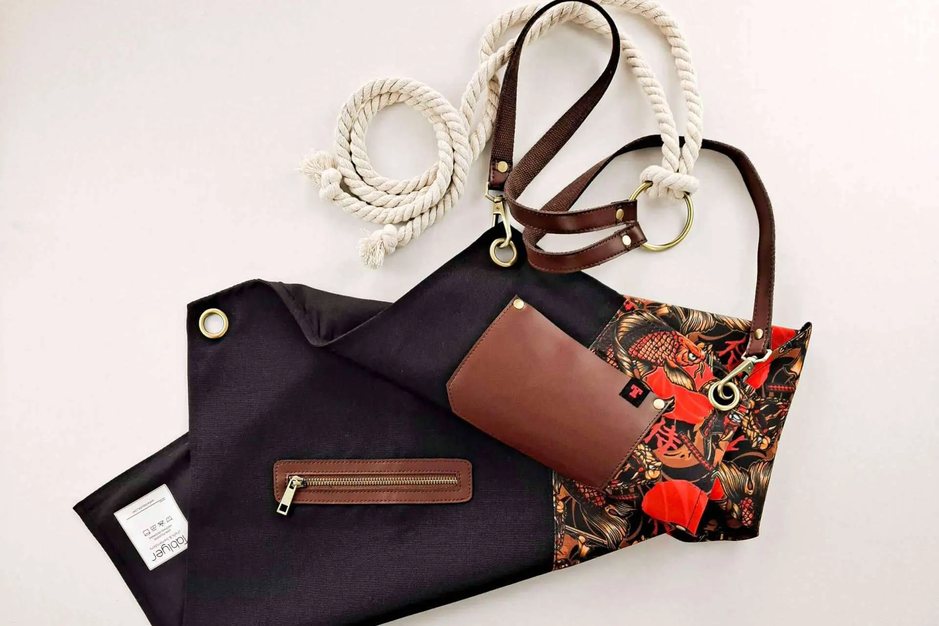 El delantal Yakuza es un accesorio fabricado para bartenders y cocineros con estilo. Su diseño presenta un novedoso patrón con motivo oriental, complementado con detalles confeccionados en piel sintética de color marrón oscuro. Estos últimos incluyen un bolsillo lateral con cremallera, que facilita las tareas de los usuarios, así como correas de soga trenzada con un suave tacto sobre el cuerpo, que permiten anudar la prenda en la cintura con mucha facilidad. Por otra parte, su tejido de poliéster brinda frescura y comodidad en cada jornada de trabajo.