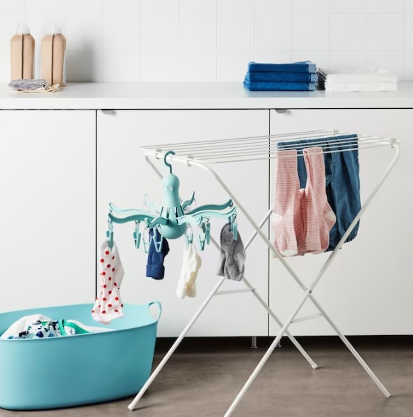Siempre estamos pensando en ahorrar espacio en casa y si eres de los que no tiene ni un hueco para tender la ropa, te vendrá muy bien PRESSA, un colgador con 6 pinzas, ideal para tus calcetines o tu ropa interior. ¡Y lo puedes plegar para guardarlo! El colgador con pinzas cuesta 3,99 euros. Un consejo más: si necesitas un tendedero vertical o que ocupe poco espacio, te recomendamos MULIG.