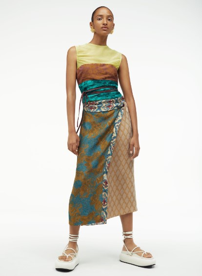 Realmente, lo que no entendemos es a quien se le ocurrió que dos piezas de tela unicolor lisas pegadas en forma horizontal, podrían combinar con unos trozos de tela estampadas colocadas en forma vertical. Y si la inspiración no fue tribal, entonces ¿cuál fue?