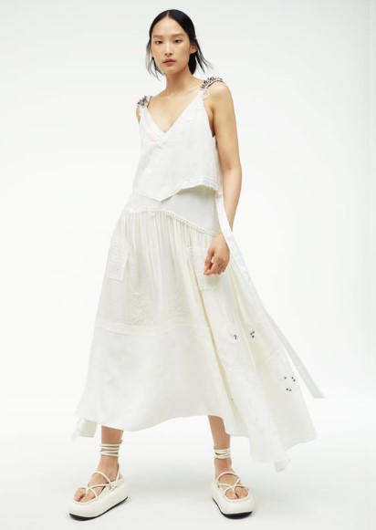 Un Jacquard floral, texturas plisadas y tul delicado se unen para crear propuestas relajadas pero elegantes. Detalle de abertura lateral en bajo. A nosotros lo que nos parce es que alguien se volvió loco con las tijeras y varios rollos de telas blancas y algo había que hacer con ello, y ¡lo hicieron! Pero además se atreven a venderlo en 249,00 €.