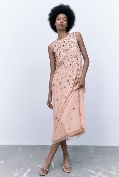 Zara lo describe como un vestido líder de cintas en color rosa pastel. Escote en la espalda y aplicación de pedrería floral con recubrimiento por 129,00 €. Para nosotros es una simple bata de andar por casa en la que unas niñas armadas con una pistola de troquelar y una bolsa llena de pedrería.