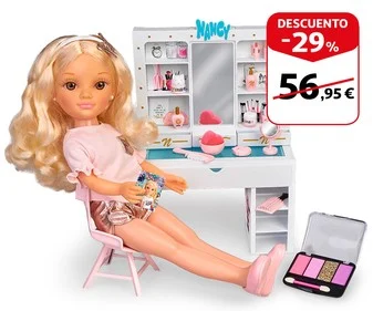 Los accesorios originales son 18, incluyendo stickers, maquillaje de verdad, planchas de pelo, secador y cremas. Esta Nancy rubia de pelo largo y rizado de ojos marrones viene vestida de forma moderna, con camiseta con volantes, diadema de mariposa y pantalones metalizados. Antes te hubiera costado 56,95 euros, pero ahora se queda en 39,99 tras el descuento del 29%.