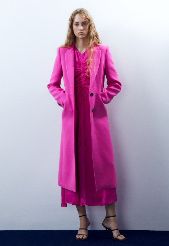 Sfera tiene disponible varias chaquetas y abrigos que no pueden faltar para usar esta temporada de otoño/invierno tanto en tiendas físicas como en la web. Hemos visto este abrigo de paño largo con solapa fucsia. Tiene cierre con botones color negro. El largo llega hasta por debajo de la rodilla, ideal para cubrirte en invierno. Actualmente, no está en la tienda web, pero la tienda avisa que pronto puede estar disponible. El precio de venta es de 99,99 euros.
