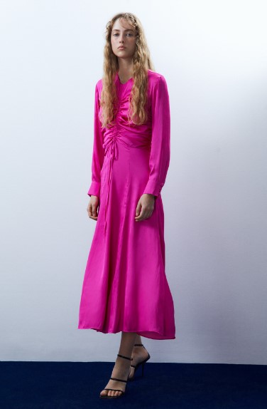 Este es un vestido largo de Sfera con fruncido en cintura ajustable con cintas. Este modelo cuenta con cuello caja con cierre trasero de cremallera. Disponible solo en color fucsia y en las tallas del S al L. El precio con descuento es de 19,99 euros. Toda una ganga para aprovechar.