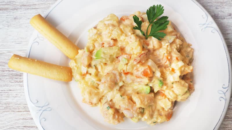 Puedes hacerla más al estilo de la ensaladilla rusa y añadir ingredientes como las aceitunas o las tiras de pimiento rojo. También puedes optar por una versión un poco más vegetal y añadir lechuga bien picada, o una manzana en daditos.