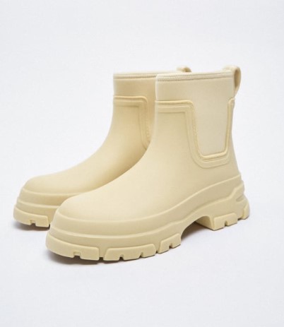Estos botines de agua con goma de Zara son un complemento práctico y elegante para tu armario. La combinación de materiales y el tejido elástico los hace muy cómodos. Puedes llevarlos con o sin calcetines. Su detalle de tirador trasero le da un toque de estilo y la altura de su suela es de 5 cm. No te pierdas esta oferta: ¡solo 15,99 euros!