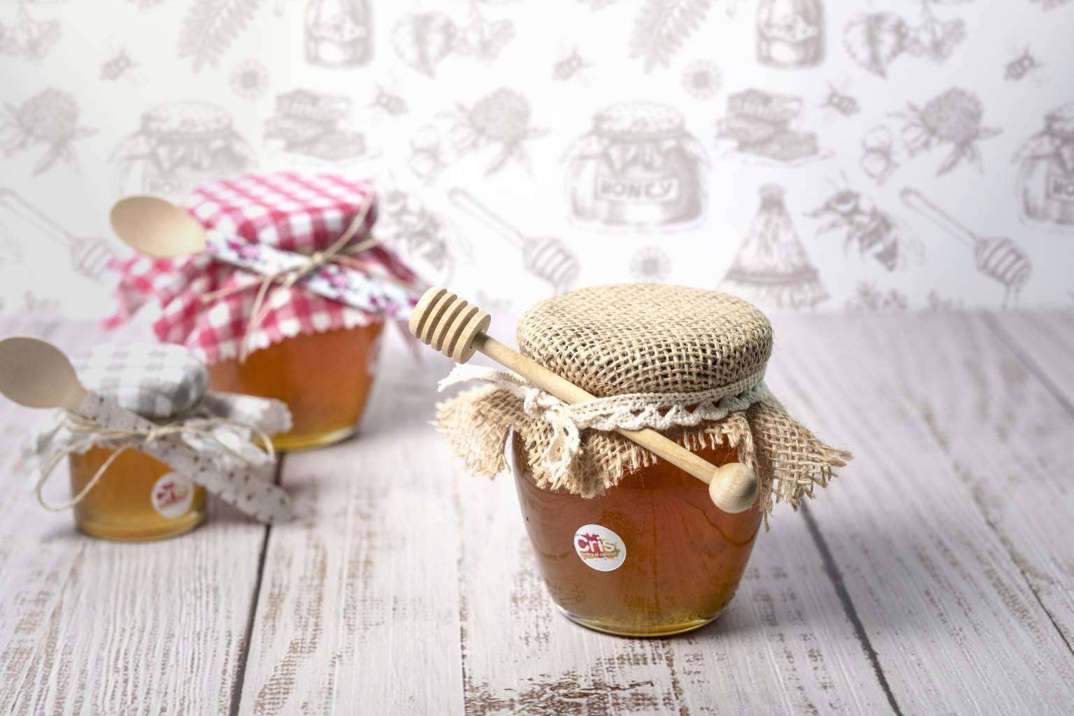 Para coincidir con el motivo del obsequio, la empresa ofrece una presentación delicada con decoraciones, lazos, etiquetas, cuchara y palo para mover la miel, personalizados al gusto del cliente.