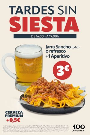 Pero no contentos con eso y como marca social que es, 100 Montaditos incorpora, además, una nueva promoción llamada «Tardes sin siesta», que estará vigente todos los días, a excepción de los miércoles y los domingos. Entre las 16:00 y las 19:00 de la tarde, los clientes podrán disfrutar una nueva propuesta que consiste en una jarra Sancho (o refresco) + 1 aperitivo por solo 3 euros.