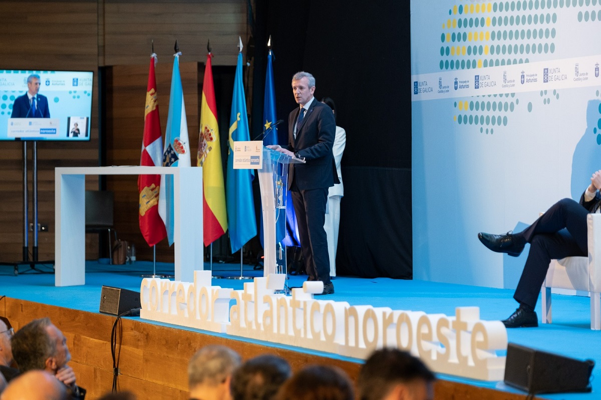 “El noroeste de la Península Ibérica no se resigna a ser periferia. Tiene la determinación de estar en el centro del mundo”, resaltó durante su intervención el presidente gallego, Alfonso Rueda, quien destacó la importancia de que las tres comunidades, con Gobiernos de distintos colores políticos, estén unidas a favor de los intereses de sus territorios. “España también tiene futuro porque Galicia, Asturias y Castilla y León tienen un futuro en el que hay que compartir, en el que todos tenemos que aportar y que debe correr por las vías del Corredor Atlántico que transitaremos unidos”, indicó.
