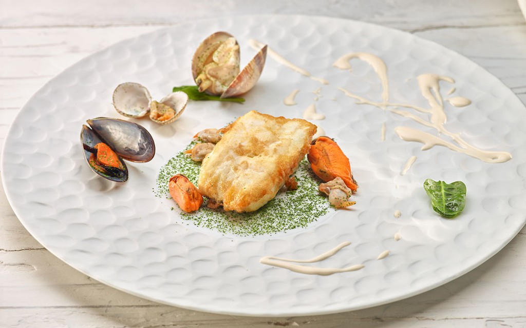 4. Acabado: Para la merluza, quitar la piel del filete con un cuchillo y cortarlo en cubos de 6 cm. Sazonar y pasar por el huevo batido. Freír en aceite de oliva caliente durante un minuto y medio por cada lado y sofreír con unos dientes de ajo machacados.
