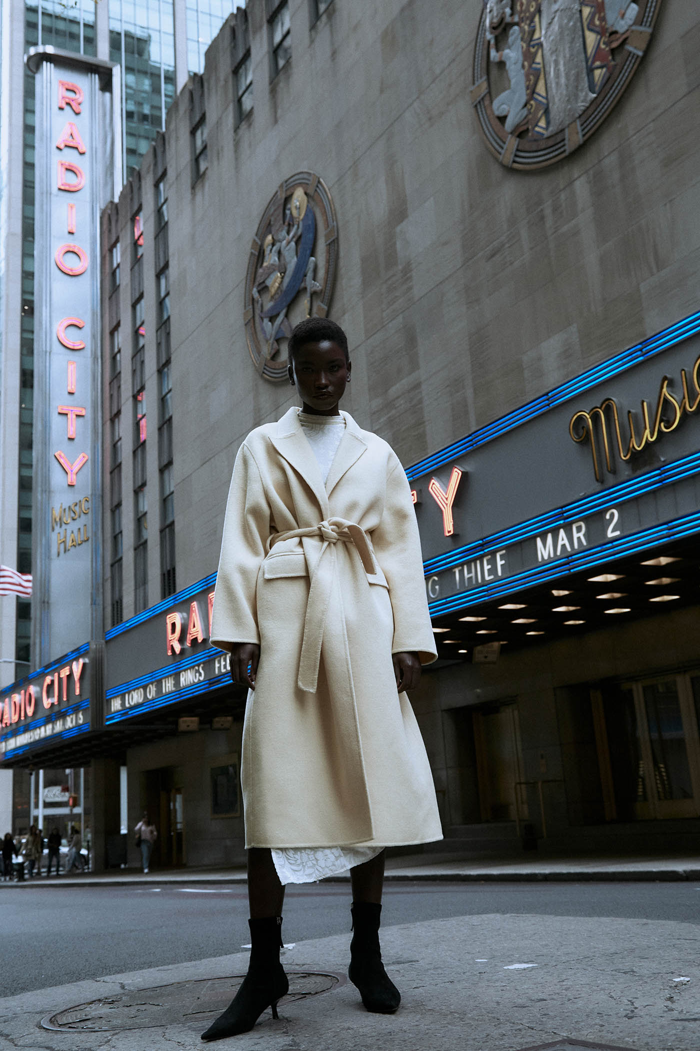 Hoy en día, la ropa oversize está de moda, tal y como demuestra este abrigo. Es una prenda oversize con solapa y lazada a tono, además de tener bolsillos en la parte delantera también con su propia solapa. Puede ir bien con un vestido midi devore y un botín de tacón calcetín, ambos disponibles también en la tienda.