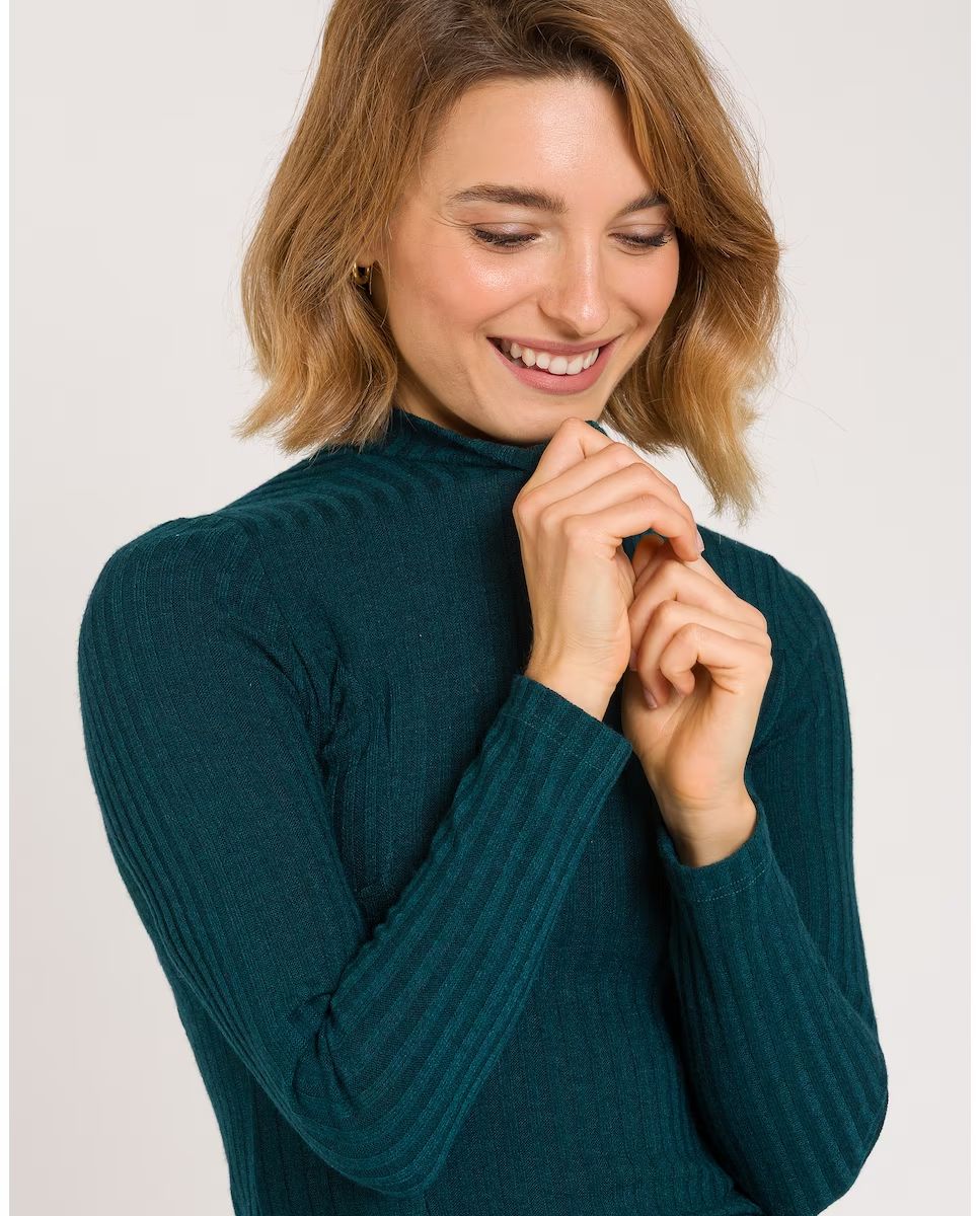 Muy ponible es este jersey de manga larga con cuello perkins de la marca Naf Naf en El Corte Inglés. Está confeccionado en viscosa, poliéster y elastano, lo que hace que el tejido sea suave, resistente y duradero.