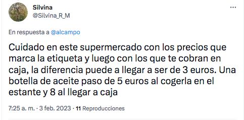 Una de las quejas más recientes vertidas en Twitter, que es la red social que recoge y difunde estas situaciones, viene dada por una usuaria que asegura que el precio de algunos productos no está actualizado en las estanterías, de forma cuando llegas a la caja y revisas después el ticket, te llevas al desagradable sorpresa de que el coste era superior. Una práctica que solo se puede calificar como un engaño. La clienta hacía alusión a un producto concreto, el aceite, uno de los básicos que más ha subido de precio en los últimos meses. “Cuidado en este supermercado con los precios que marca la etiqueta y luego con los que te cobran en caja, la diferencia puede a llegar a ser de 3 euros. Una botella de aceite paso de 5 euros al cogerla en el estante y 8 al llegar a caja”, advertía en su tuit. Por el momento la marca no ha dado ninguna respuesta.