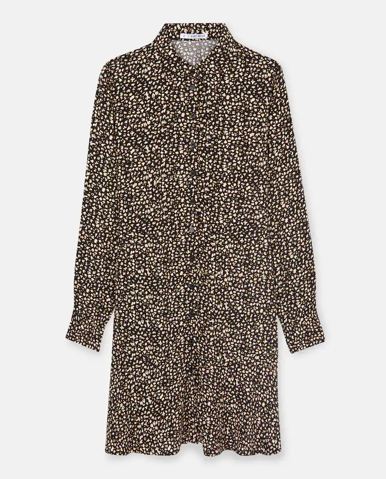 El vestido camisero es un diseño que siempre merece la pena tener como fondo de armario. Es muy versátil, ya que puede formar parte de looks clásicos y elegante, o de estilismos muy casuales, todo depende de como se combine. En El Corte Inglés podemos conseguir este diseño corto, de manta larga, con puño, cuello kent y abotonado completo. Tiene una goma en la espalda para entallar la cintura. Es de viscosa, un tejido suave y ligero. Tiene un estampado estilo animal print y se puede elegir entre color negro, marrón y marrón oscuro. Tiene un 60% de descuento y solamente cuesta 11,99 euros.